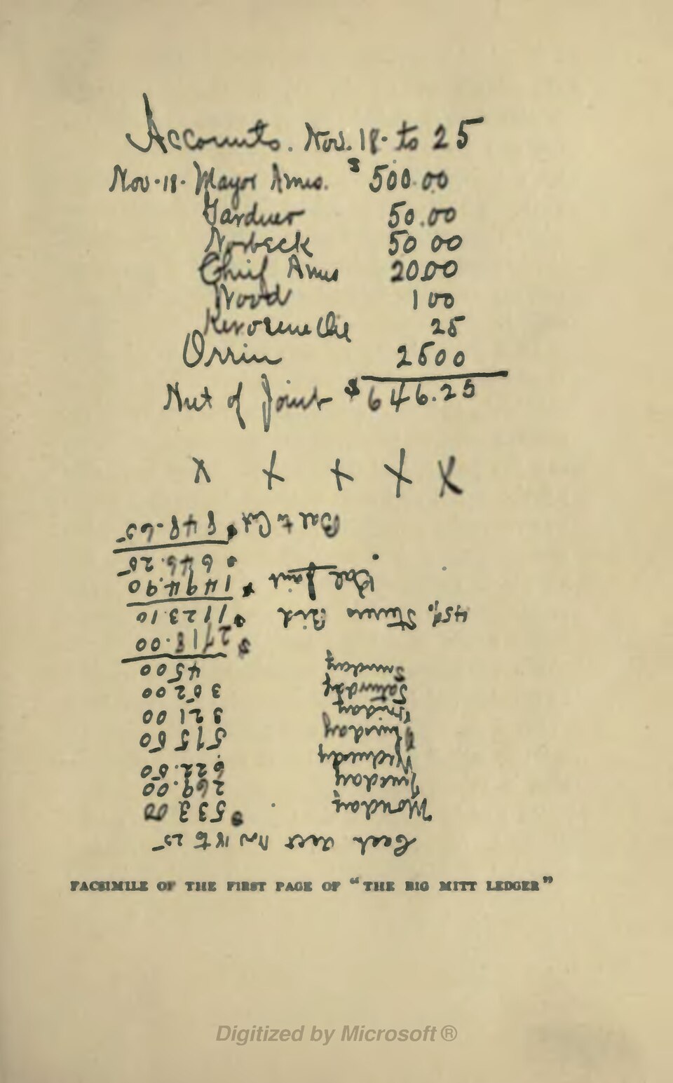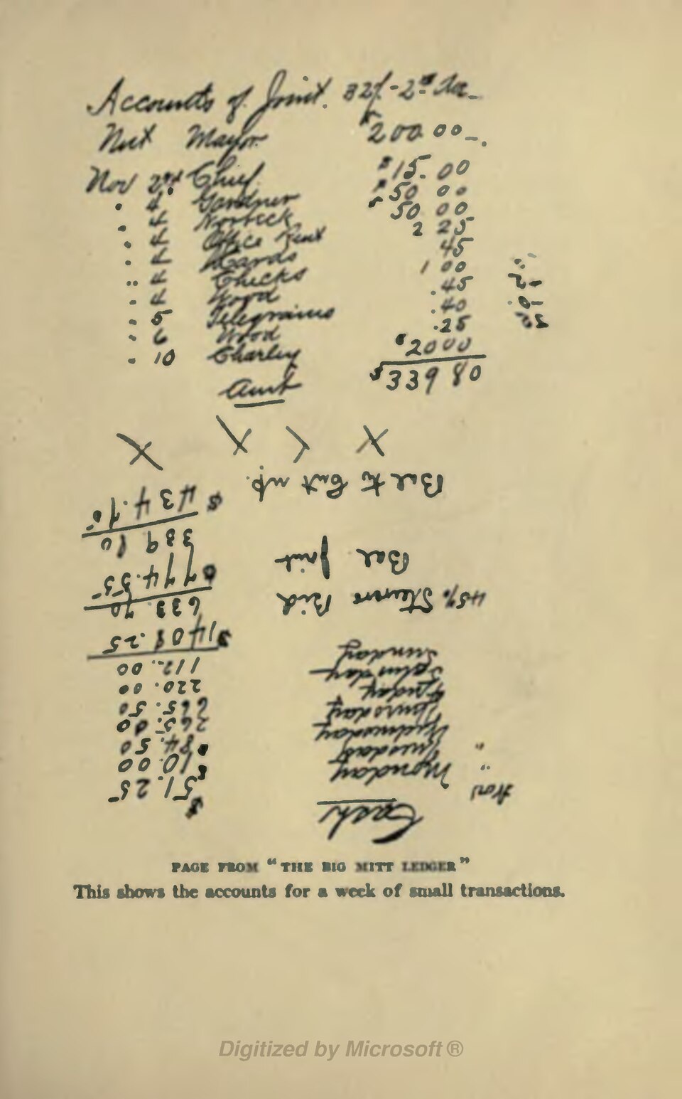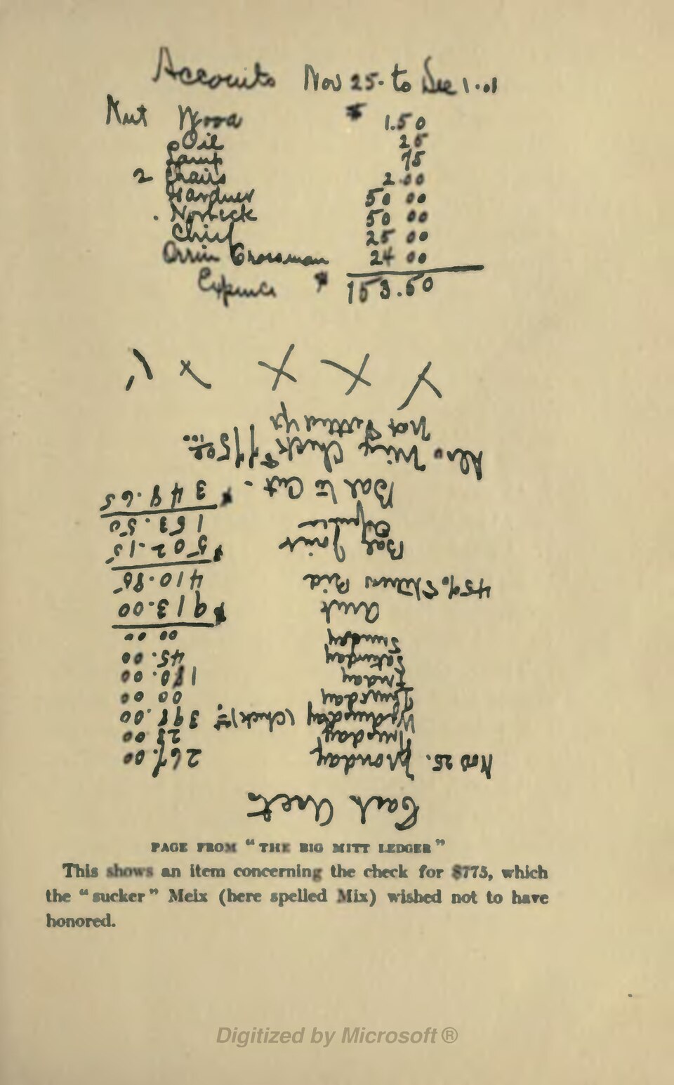 “Link” Crossman, another confidence man who was with Edwards, said that Gardner demanded $1,000 at first, but compromised on $500 for the mayor, $50 for Gardner, and $50 for Norbeck. To the chief, Fred Ames, they gave tips now and then of $25 or $50. “The first week we ran,” said Crossman, “I gave Fred $15. Norbeck took me down there. We shook hands, and I handed him an envelope with $15. He pulled out a list of steerers we had sent him, and said he wanted to go over them with me. He asked where the joint was located. At another time I slipped $25 into his hand as he was standing in the hallway of City Hall.” But these smaller payments, after the first “opening, $500,” are all down on the pages of the “big mitt” ledger, photographs of which illuminate this article. This notorious book, which was kept by Charlie Howard, one of the “big mitt” men, was much talked of at the subsequent trials, but was kept hidden to await the trial of the mayor himself.